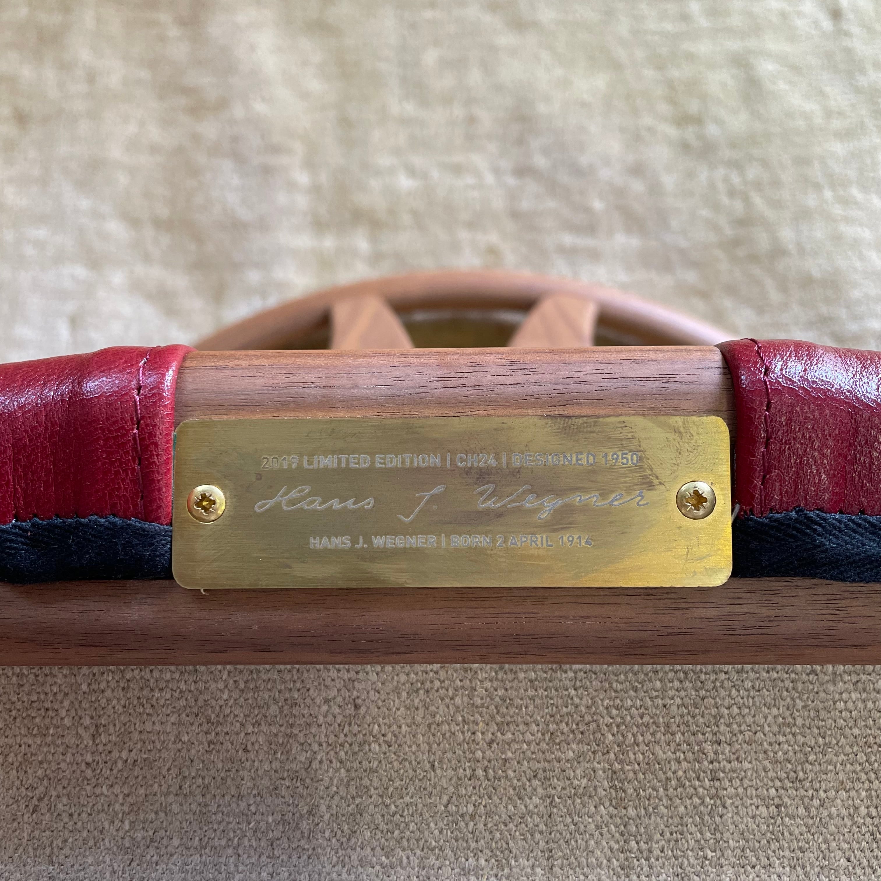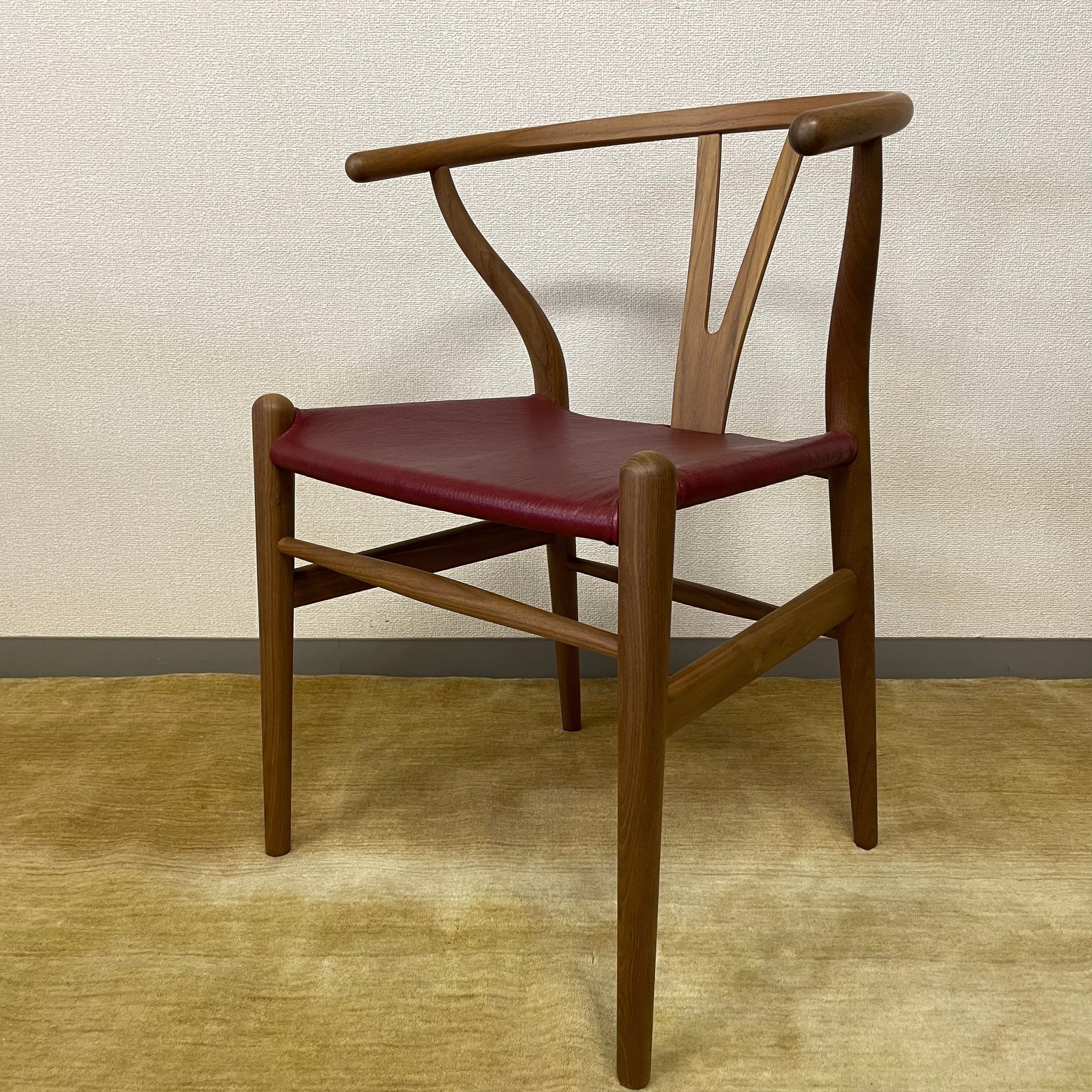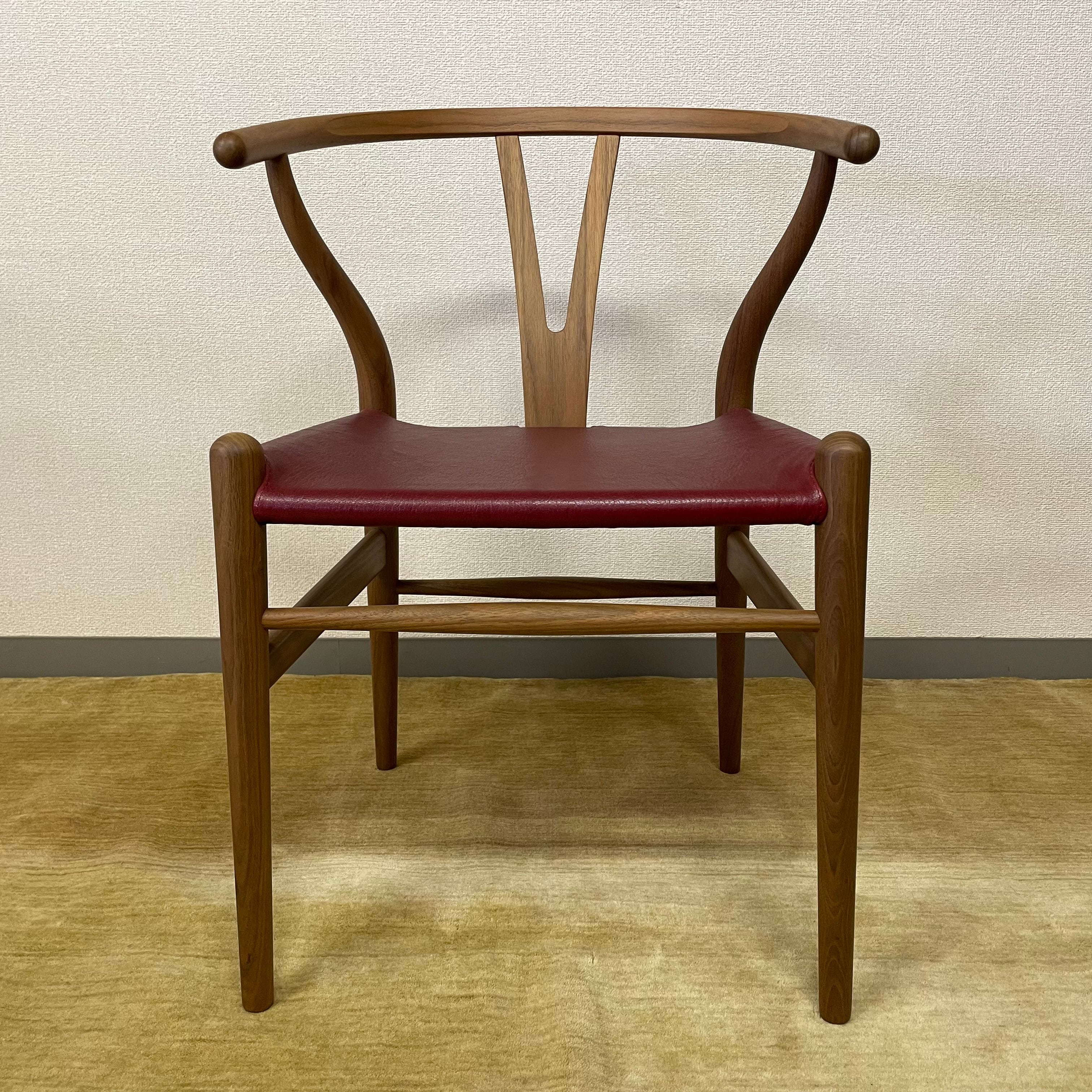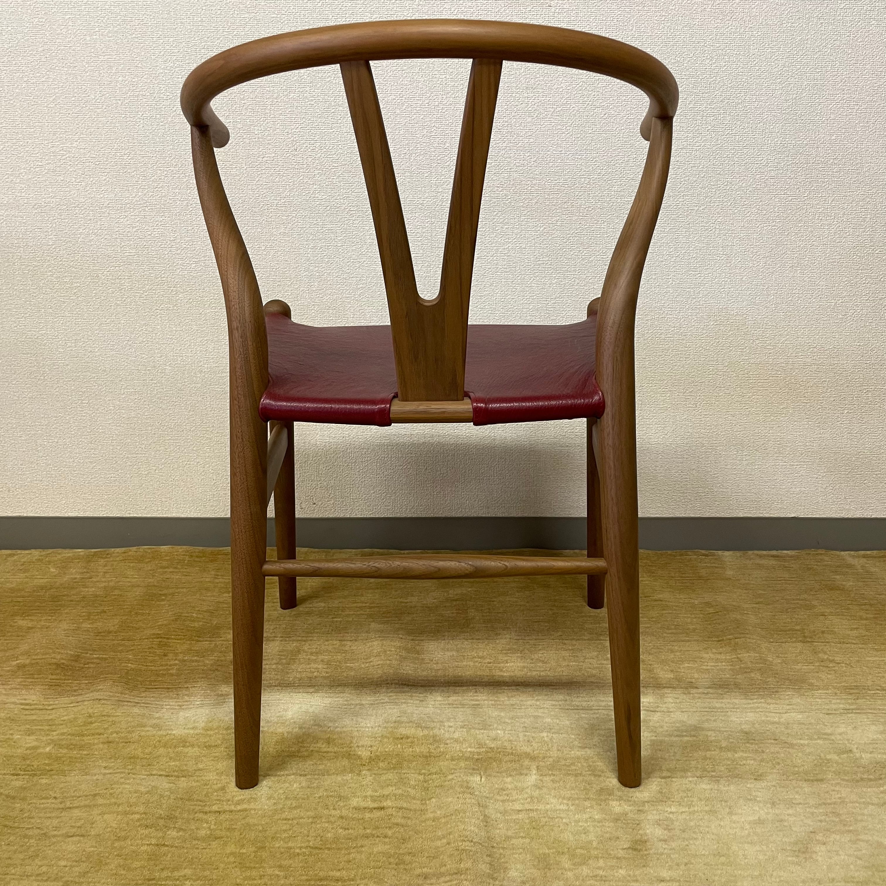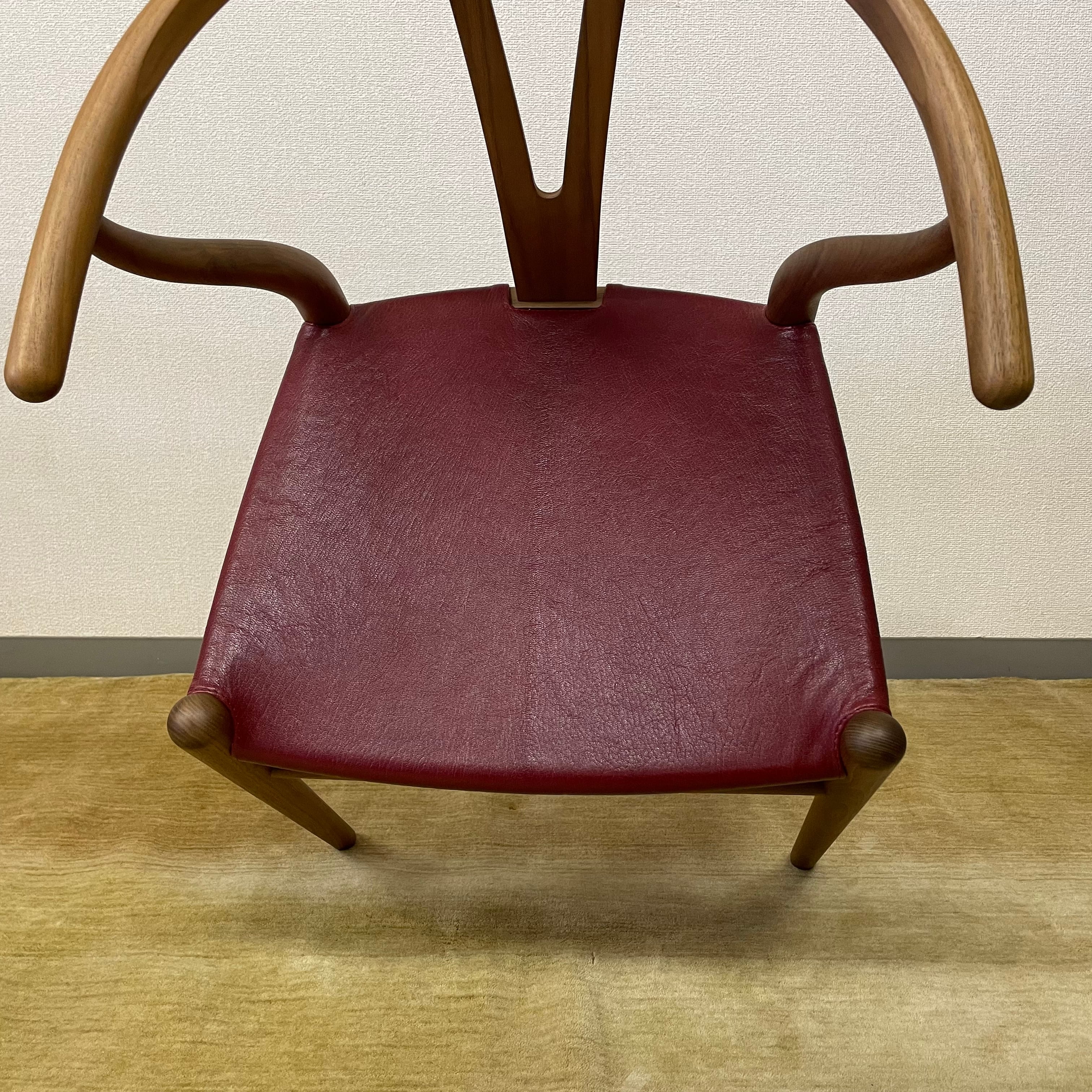 本商品はYチェアのデザイナーであるハンスJ.ウェグナーの2019年の生誕モデルで、ウォルナット材でオイル仕上げ、座面はゴートレザー(アニリン仕上げ)レッド色。生誕モデルを証明するプレートも付いています。また、本物であることを証明する証明書も付属。限定生産された大変貴重な商品です。